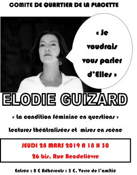 « Je voudrais vous parler d’elles » : c’est le titre du spectacle auquel vous invite la prochaine soirée organisée par le Comité de quartier de la Placette (*). Dédié à la condition des femmes, ce spectacle entièrement conçu, mis en scène et interprété par Elodie GUIZARD (avec la complicité de Tella KPOMAHOU) fut créé et joué à Nîmes, en novembre 2018, à la Maison de la Région, à l’occasion de la Journée internationale contre les violences faites aux femmes. C’est dire s’il nous parle d’un certain air du temps.